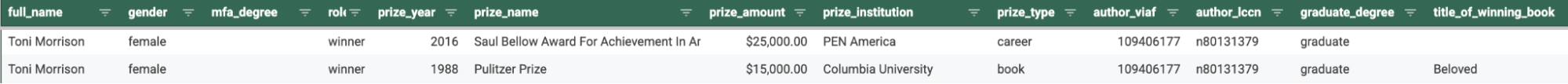 Example: First two entries for Toni Morrison in “Major Literary Prize Winners and Judges”