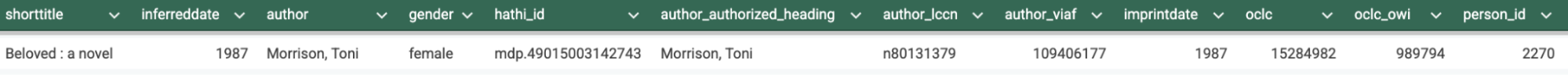 Example: Entry for Toni Morrison’s Beloved in “Prize-Winning Authors’ Books,” a dataset linked to the one above. Though the author and full_name formats differ, the datasets are still easily linked using the LCCN and VIAF ID fields.